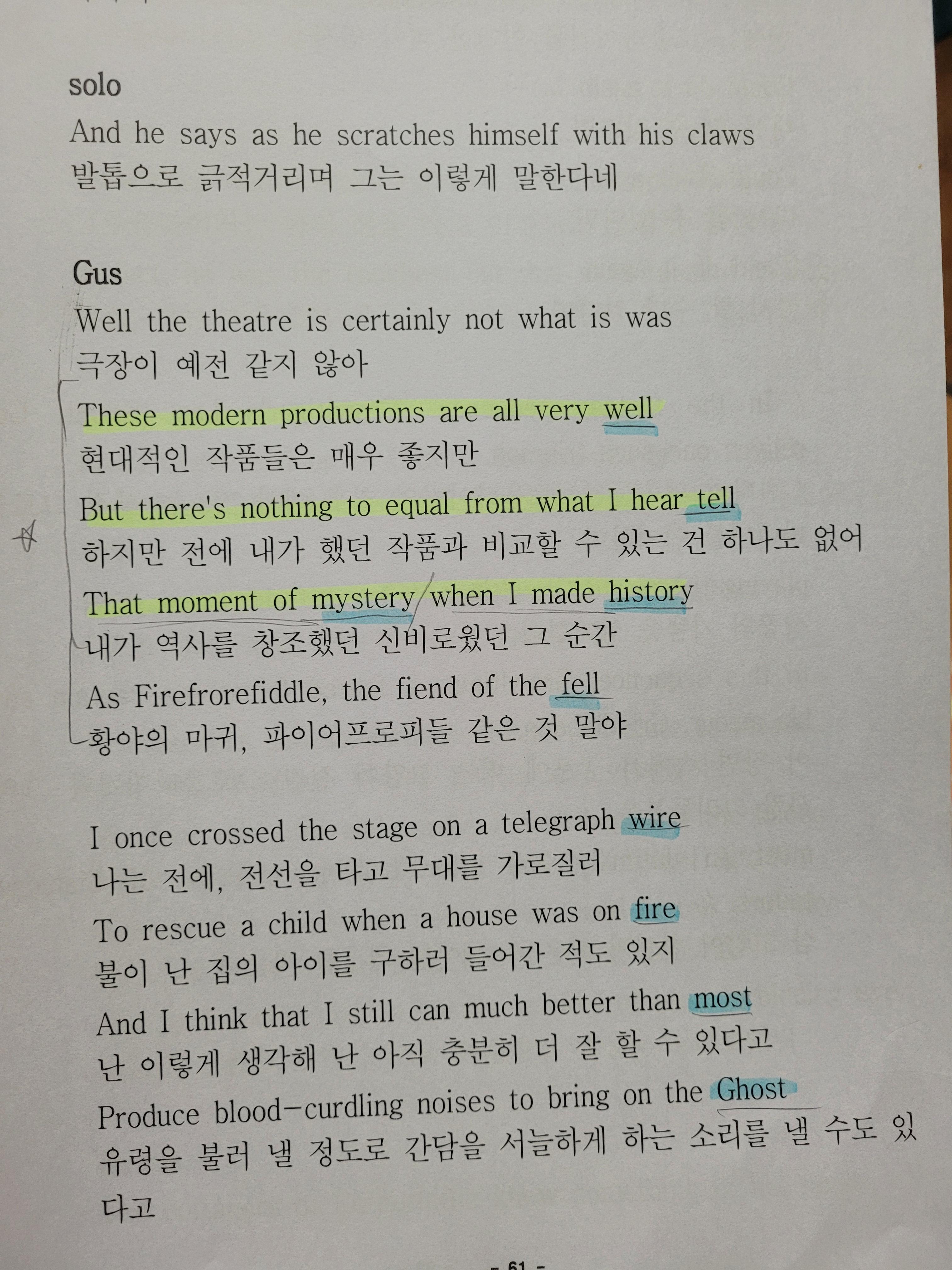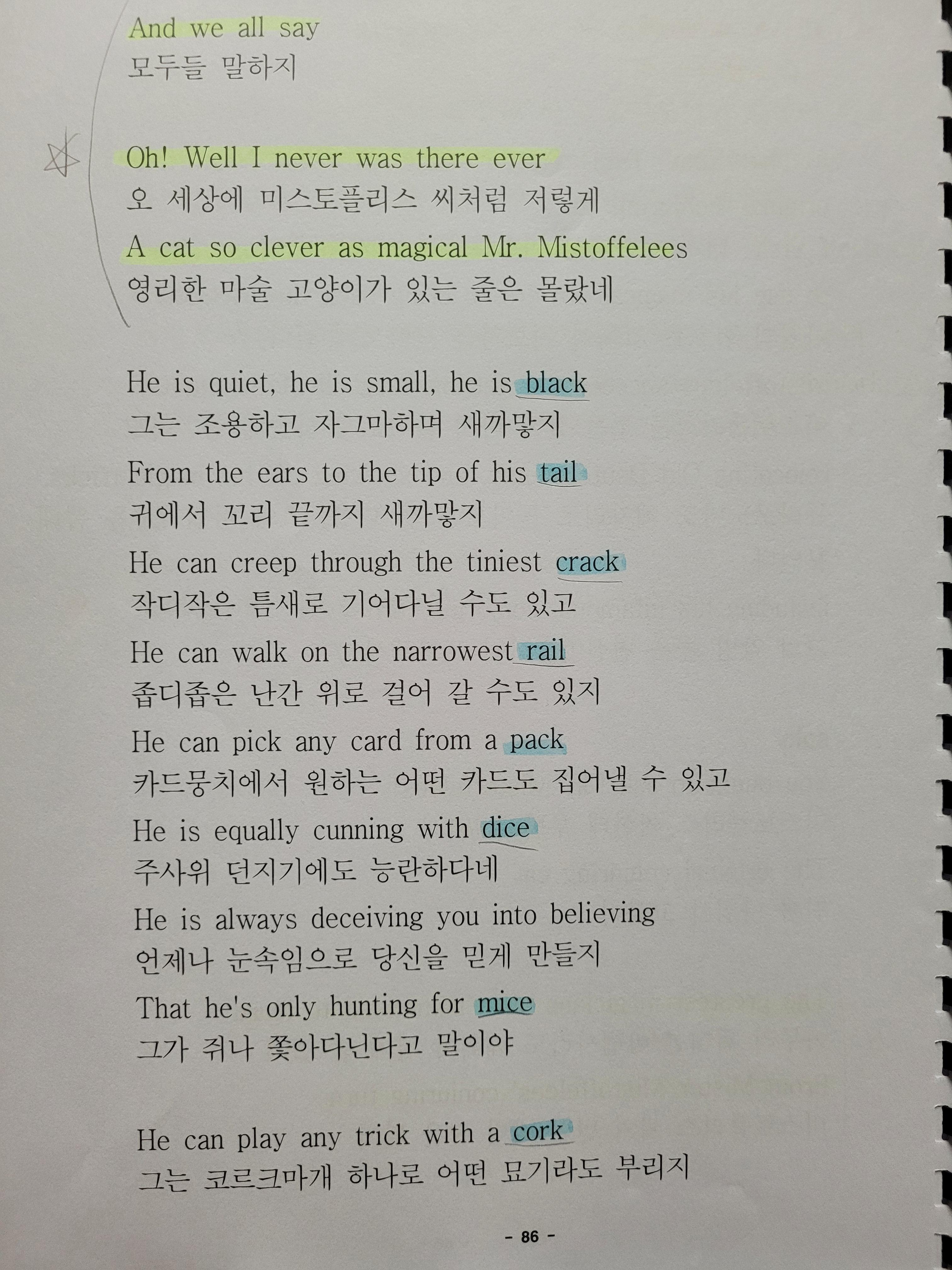 파란색 = 운율 부분(캣츠 대사에는 끝에 운율을 맞춘 단어 구성이 정말 많더라고요. 쉬운 단어들로 구성되어 있어요.)