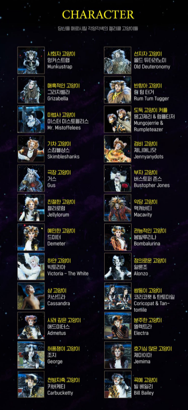아래를 보시면 정말 다양한 캐릭터의 고양이가 나오죠. (출처, 세종문화회관 캣츠 소개 페이지)